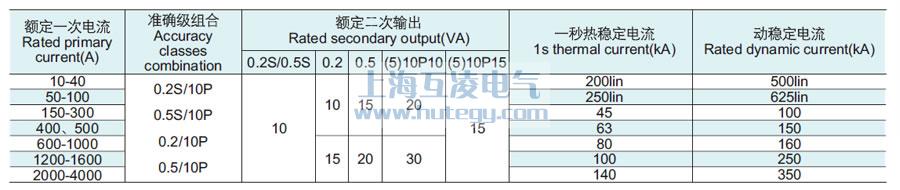 | 型號 | 額定一次電流(A) | 準 確 級 | 額定輸出(VA) | 短時熱電流(Ith)(kA) | 額定動穩定電流(Idyn)( kA) | ||||